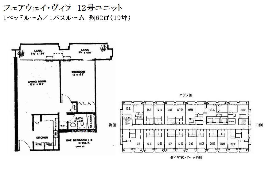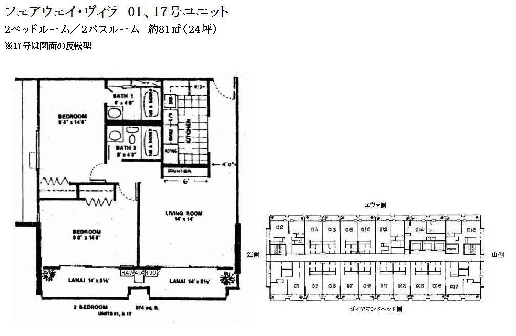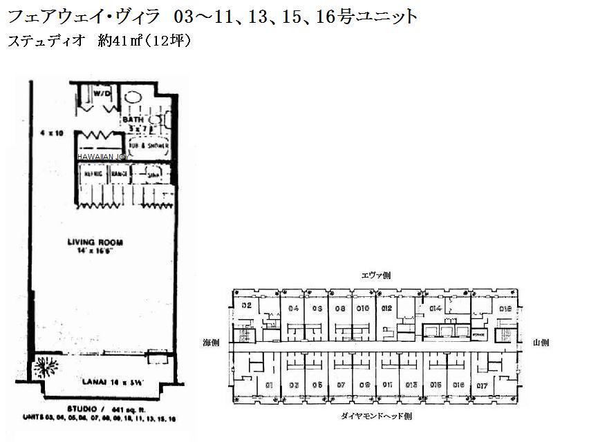 추가 설명 페어웨이 빌라는 와이키키 아라와이 스트리트에 위치한 거주자와 투자자 모두에게 매우 인기 있는 콘도미니엄입니다. 건물 옥상에는 개방감 있는 구조로 된 풀 데크와 BBQ 공간이 마련되어 있어, 와이키키 전역을 360도로 내려다볼 수 있습니다. 또한 와이키키의 콘도 중에서도 드물게 원룸 타입에도 실내에 세탁기/건조기가 설치되어 있고, 주차장 사용 권한도 포함되어 있어 임대하기 매우 좋은 조건을 갖추고 있습니다. 근처에는 인터내셔널 마켓플레이스, 슈퍼마켓, 대형 할인점 타겟(Target) 등이 있어, 와이키키 중심에 있으면서도 매우 살기 좋은 환경을 자랑합니다. 호실 번호가 01번과 17번으로 끝나는 유닛은 2베드룸 타입, 02번, 12번, 14번, 18번으로 끝나는 유닛은 1베드룸 타입입니다. 월 관리비에는 케이블 TV, 온수 요금, 수도 요금이 포함되어 있습니다.