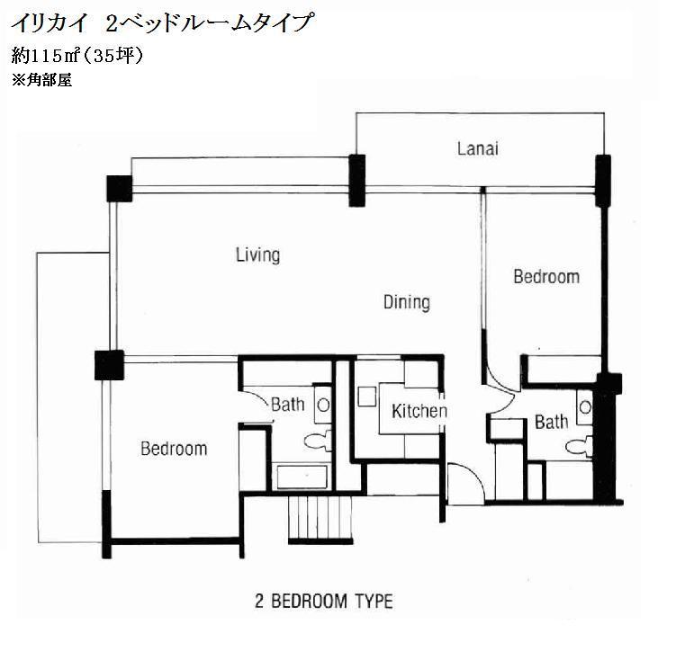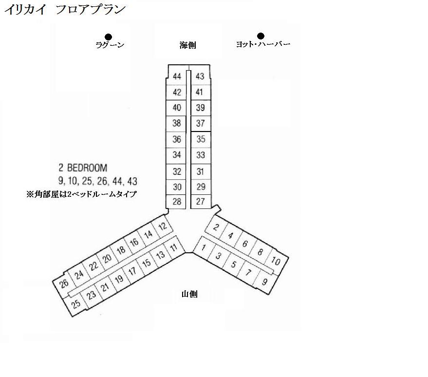 | 추가 설명 | 「일리카이」는 일리카이 마리나에 자리잡고 있는 호텔 콘도입니다. 로비 층에는 카페, 편의점 등 여러 상점이 있으며, 최상층에는 이탈리안 레스토랑이 위치해 있습니다. 인근 해변까지 도보로 이동할 수 있고, 알라모아나 비치파크와 쇼핑센터도 가까운 거리에 있습니다. 평면은 1베드룸과 2베드룸 타입이 있으며, 2베드룸 타입은 호실 번호 끝자리가 09, 10, 25, 44, 43번인 코너 유닛입니다. 대부분의 1베드룸 유닛은 분양 당시의 칸막이를 철거하여 실제로는 원룸 형태의 플로어플랜으로 되어 있습니다. 월 관리비에는 케이블 TV, 온수 요금, 수도 요금이 포함되어 있습니다. | ||