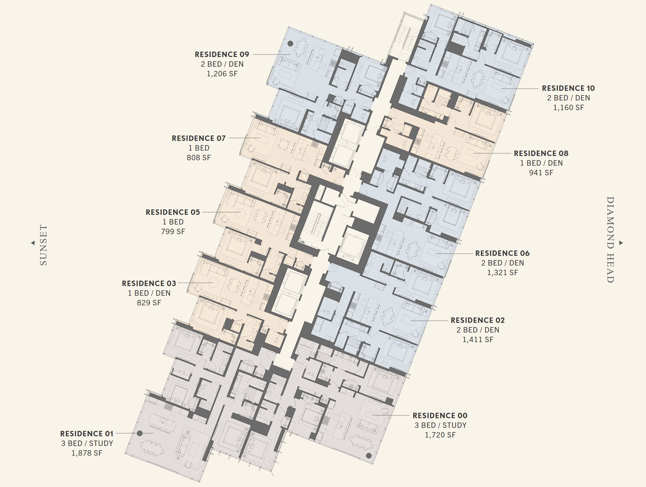 타입은 1배드룸 ~3배드룸이 있습니다. 3배드룸 타입은 바다쪽으로 위치하고 있습니다. 각층에 1배드룸 타입 4가구, 2배드룸 타입 4가구, 3배드룸 타입 2가구씩 배치될 예정입니다.