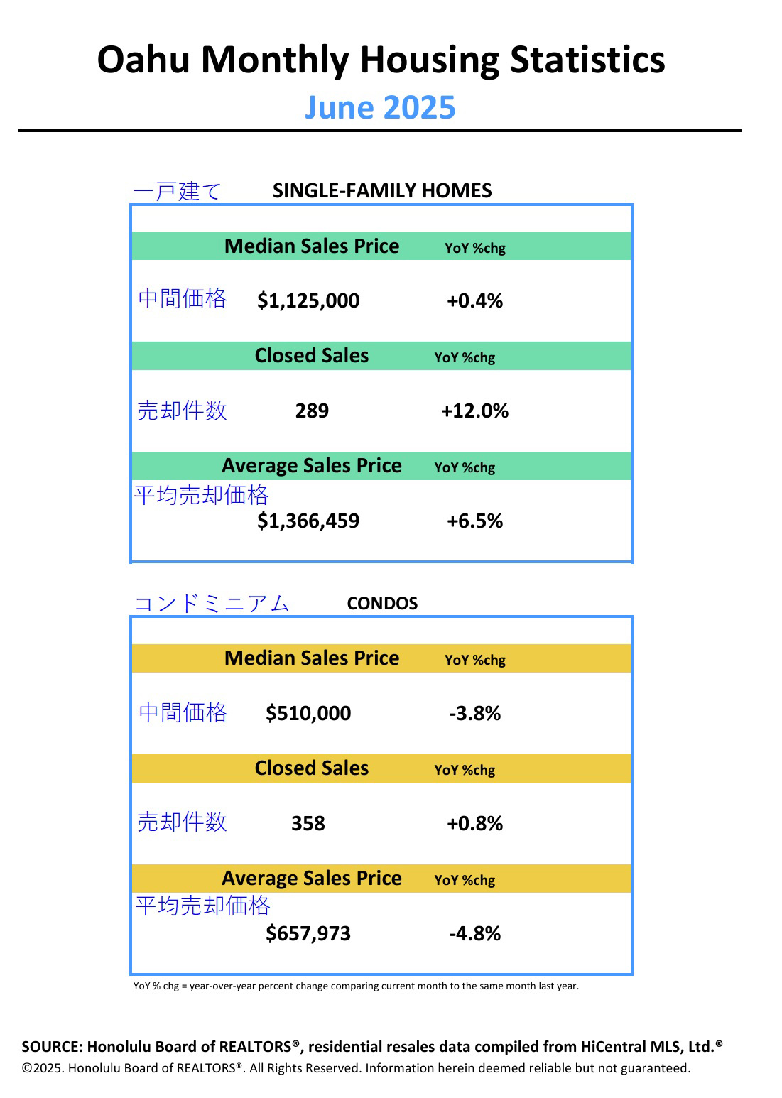ホノルル不動産協会よりオアフ島の2025年6月の住宅統計が発表されました。