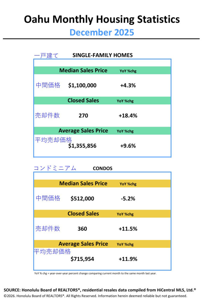 2026年01月06日 In ハワイ不動産ニュース オアフ島の2025年12月の住宅統計 ホノルル不動産協会よりオアフ島の2025年12月の住宅統計が発表されました。 <一戸建て> 中間価格は$1,100,000、前年比4.3%アップ⤴ 売却件数は270件、前年比18.4%アップ⤴ 平均売却価格は$1,355,856、前年比9.6%アップ⤴ <コンドミニアム> 中間価格は$512,000、前年比5.2%ダウン⤵ 売却件数は360件、前年比11.5%アップ⤴ 平均売却価格は$715,954、前年比11.9%アップ⤴ Tags: オアフ島の2025年12月の住宅統計