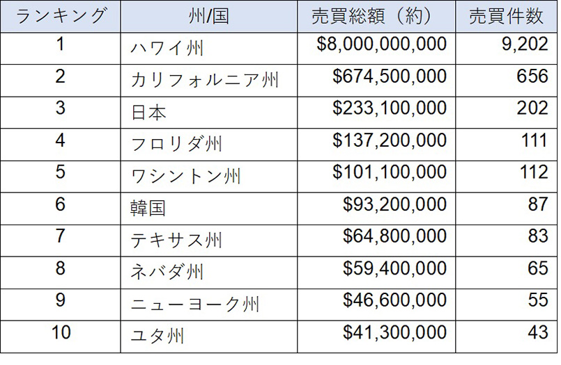 2026年02月13日 In ハワイ不動産ニュース 2025年度 ハワイ不動産 – オアフ島の買い主統計 エスクロー会社のタイトルギャランティ社より2025年度のオアフ島の買い主統計が発表されました。 2025年1月~12月までの売買総額は約$9,800,000,000、売買件数は11,097件でした。 以下が州/国別のトップ10になります。 ●フルリポート👇 https://www.tghawaii.com/wp-content/uploads/Buyer-Stats-Oahu-Q4-2025.pdf ●去年のレポート👇 https://www.hawaiianjoy.com/news/30248/ Tags: 2025年度 ハワイ不動産 - オアフ島の買い主統計